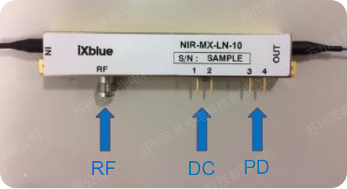 RF射频端口:一般位于调制器中间靠左侧的地方,用于接入外来射频电信号。取决于应用的频率范围,3种RF或微波端子可用。