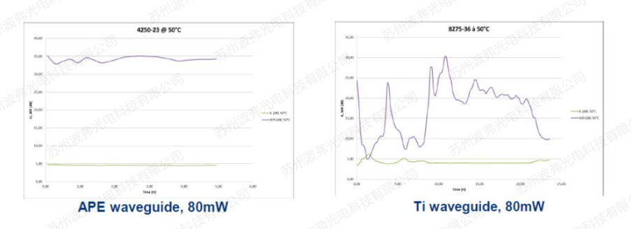 再一次声明,即使在某些厂商的参数手册上,钛扩散工艺制造出的调制器在近红外波段优于退火质子交换工艺,但是钛扩散工艺的光折变效应会在低激光功率时更早的介入,器件的性能将不再受控。所有iXblue近红外波段的调制器使用退火质子交换工艺,减小光折变的影响,提供更稳定的性能。