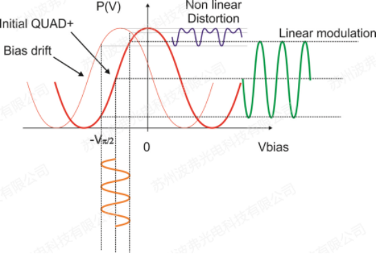 调制器传输曲线的漂移以致工作点发生变化,如果偏置电压不被重新调节,输出光调制函数发生剧烈变化,不仅仅是振幅,频率也发生变化。